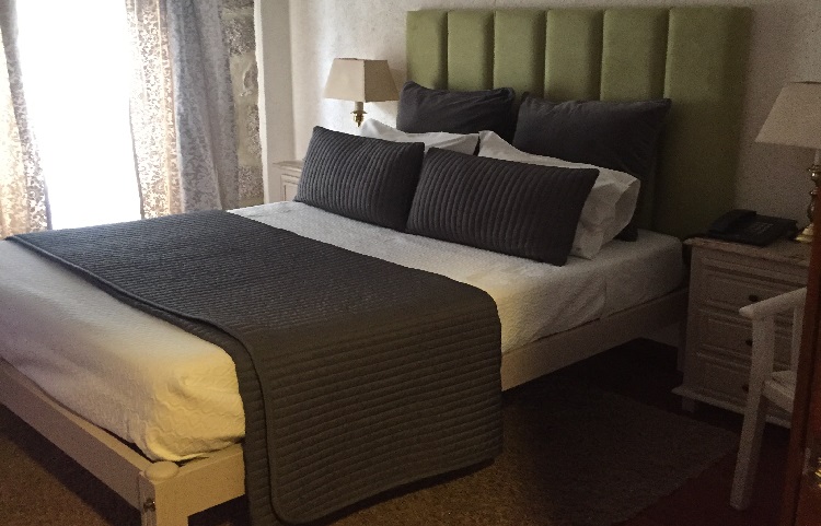 Quarto duplo com ar condicionado, uma cama de casal ou duas camas individuais, decorado de forma tradicional com móveis de madeira e pisos em parquet.