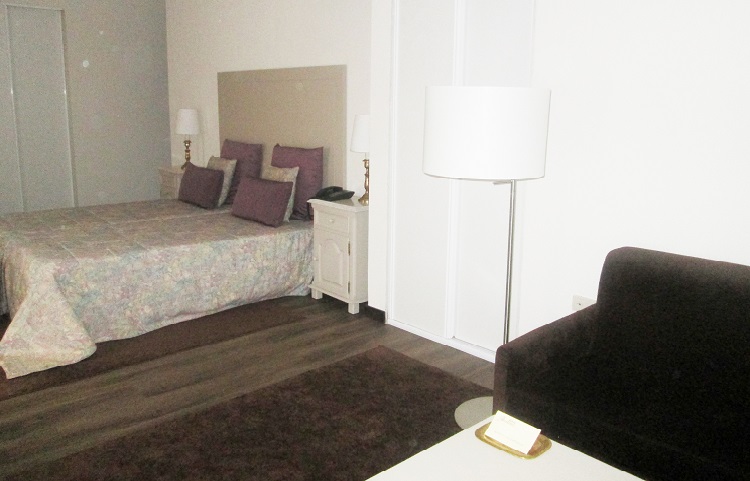 Quarto duplo com ar condicionado, uma cama de casal ou duas camas individuais, decorado de forma tradicional com móveis de madeira e pisos em parquet.