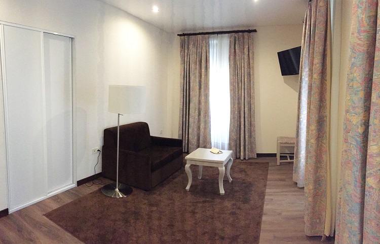 Quarto Individual está tradicionalmente decorado com móveis de madeira e pisos de parquet. Cada quarto inclui uma televisão, uma área de estar e um pátio.